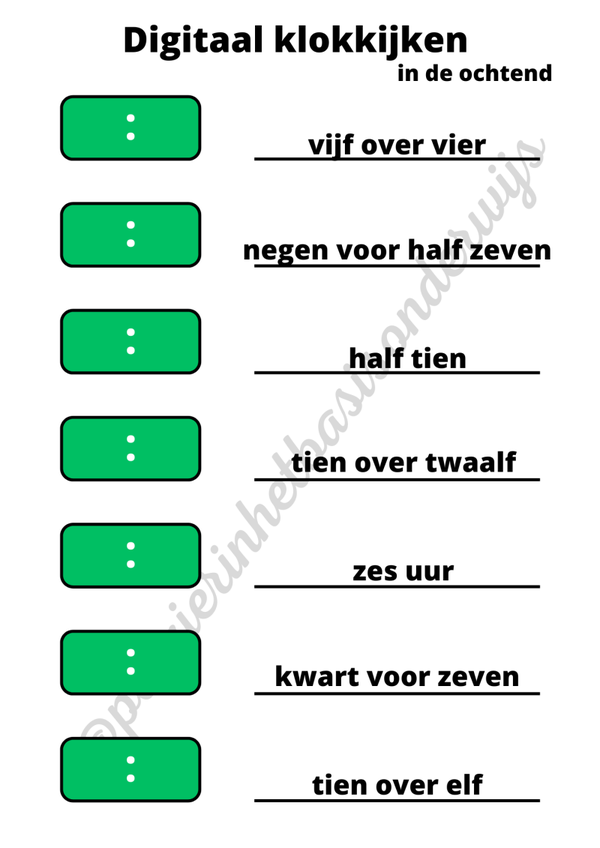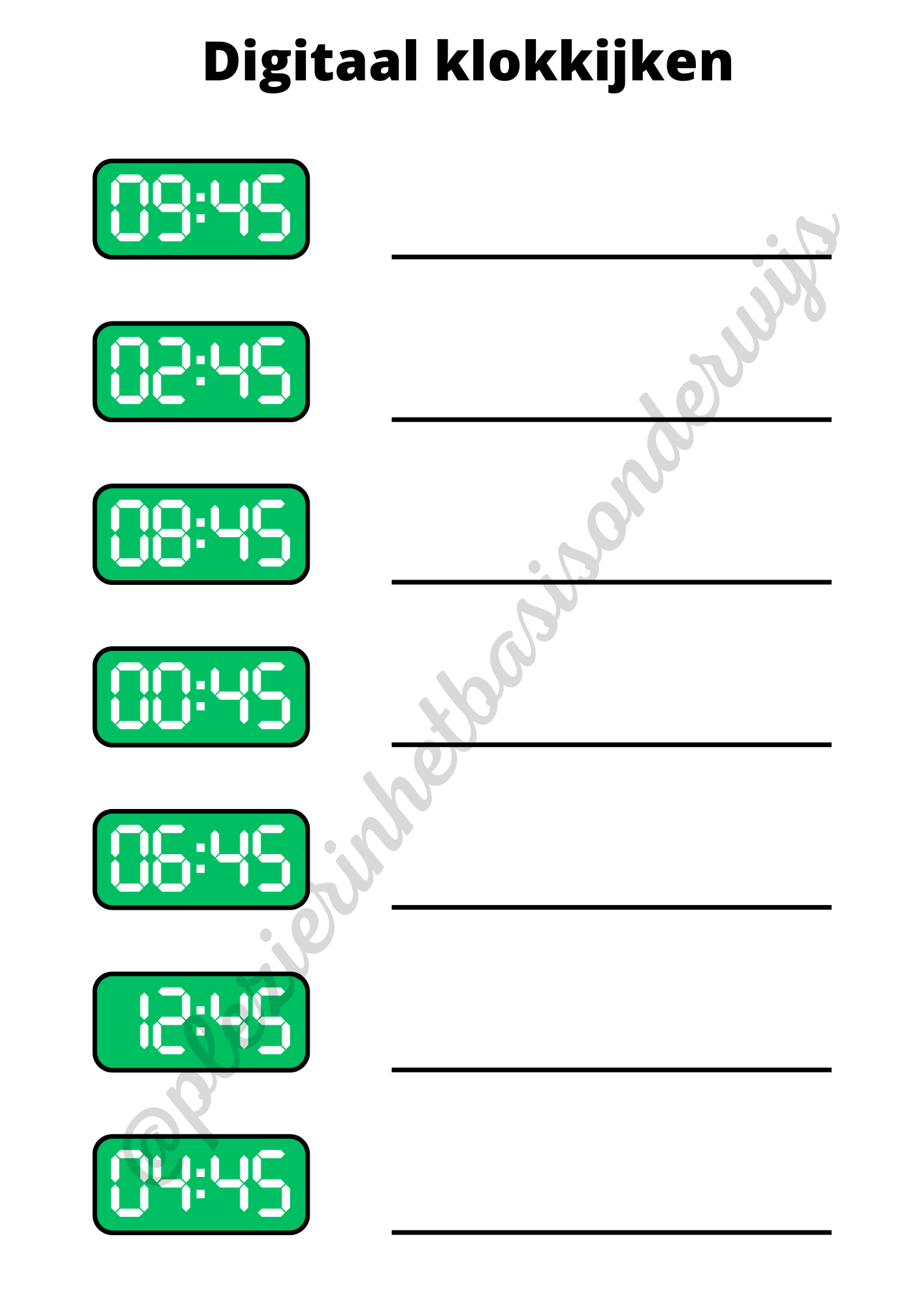 In dit digitaal klokkijken werkboekje leer je oefenen met de verschillende soorten tijden. Kun jij alle tijden goed opschrijven? Dan ben jij goed bij de tijd!